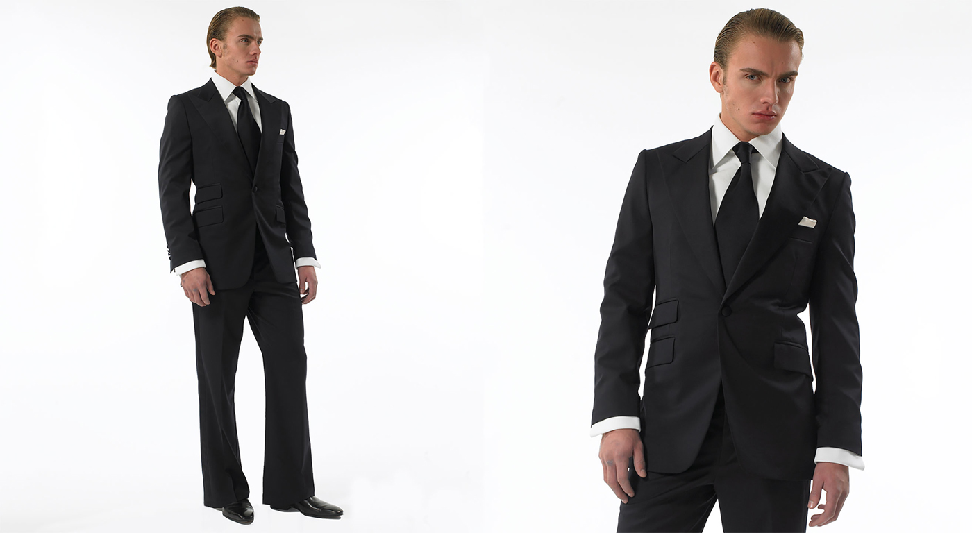 BESPOKE NAVY PEAK LAPEL SUIT, BIRDS EYE COTTON PIQUET SHIRT, CUSTOM MADE NAVY SILK TIE AND SHOES.