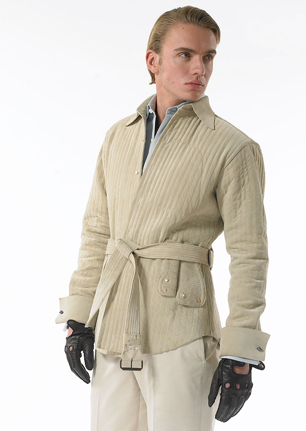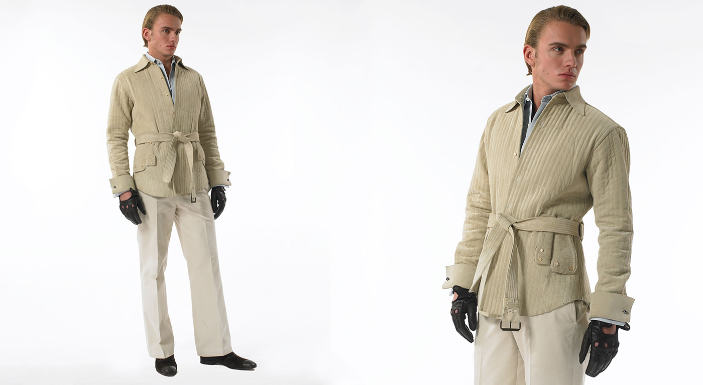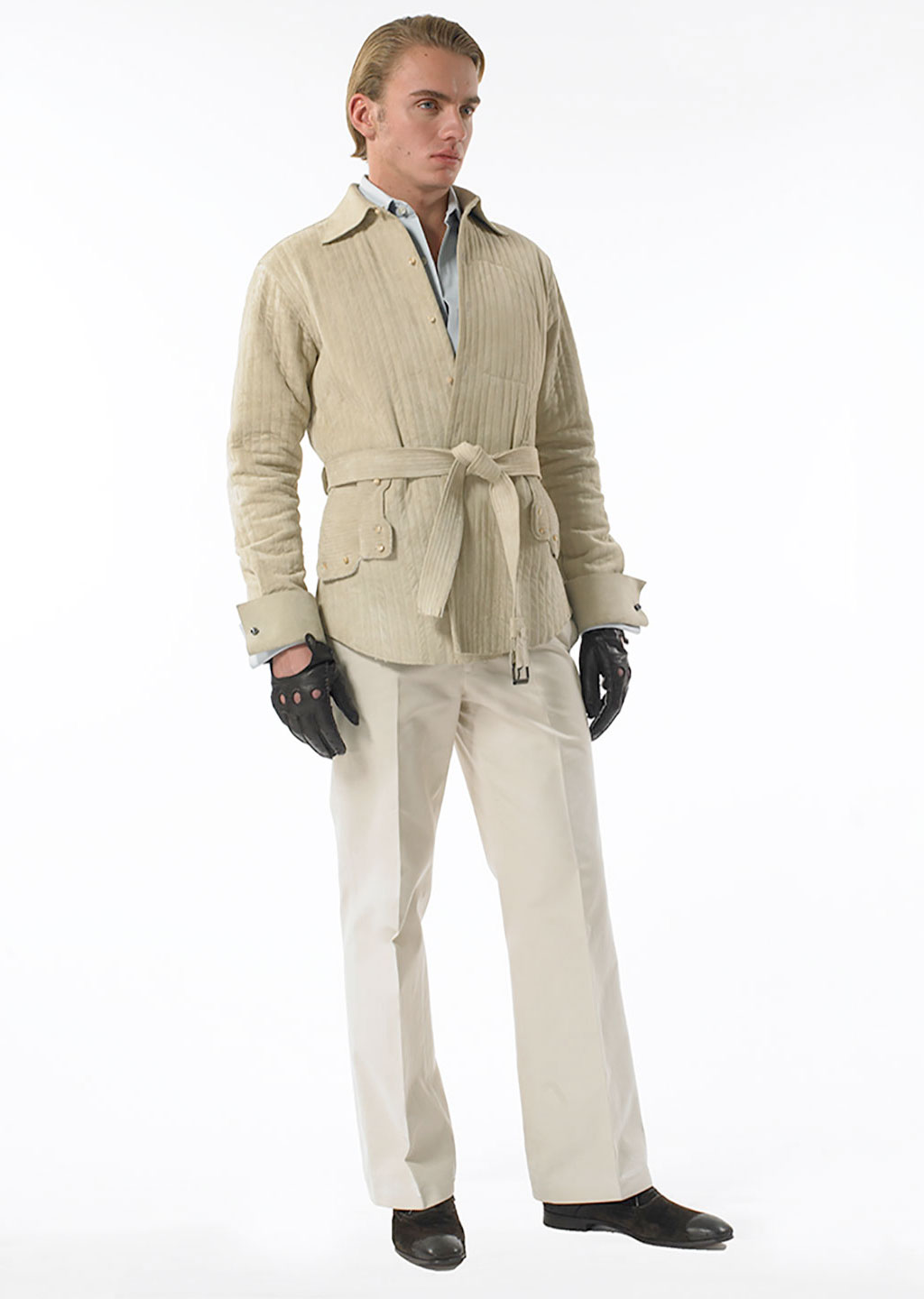 HAND QUILTED GAZELLE SUEDE AND CASHMERE JACKET, COTTON SLACKS AND SHIRT.