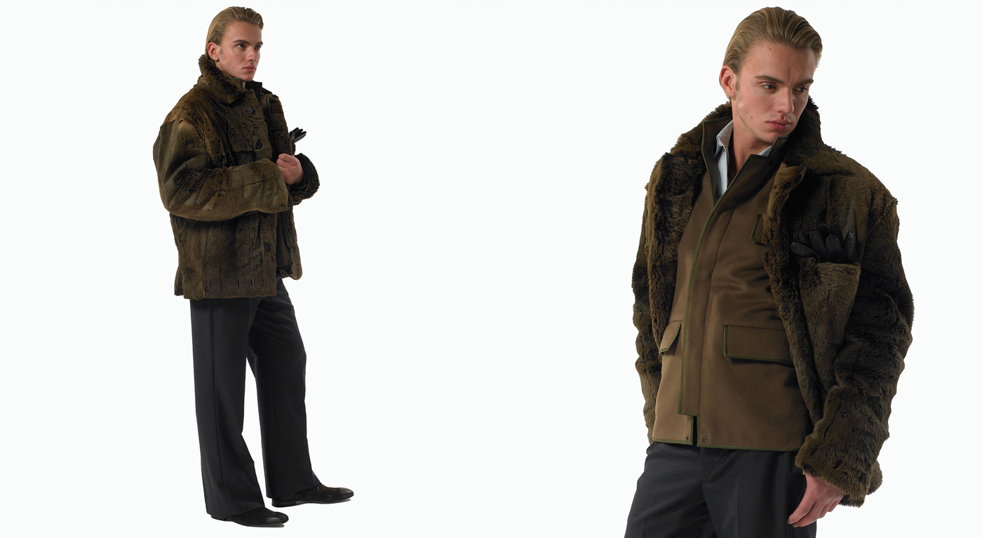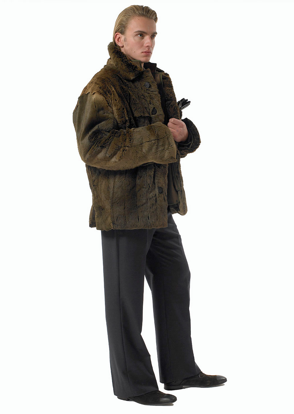 KANGAROO FUR OVERCOAT, CASHMERE AND SILK DETACHABLE LINING, CHARCOAL WOOL SLACKS.