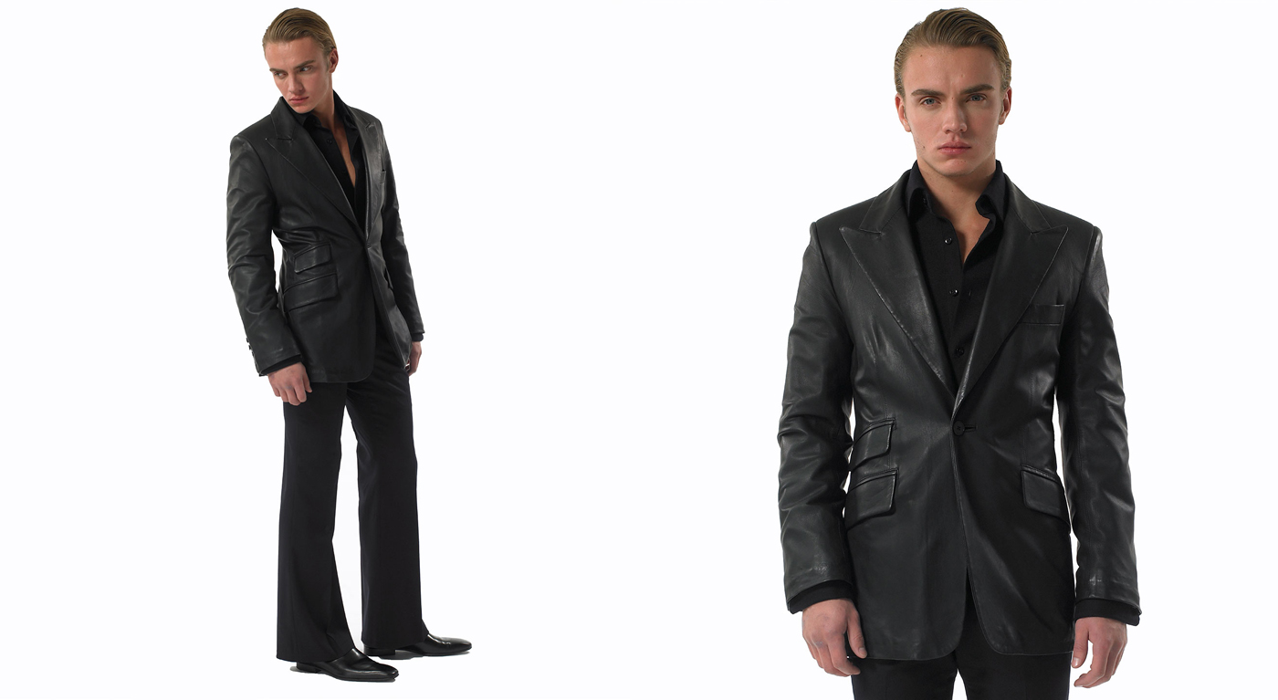 MIDNIGHT BLUE KIDD LEATHER JACKET, CASHMERE AND SILK LINED SHIRT, NAVY SLACKS.