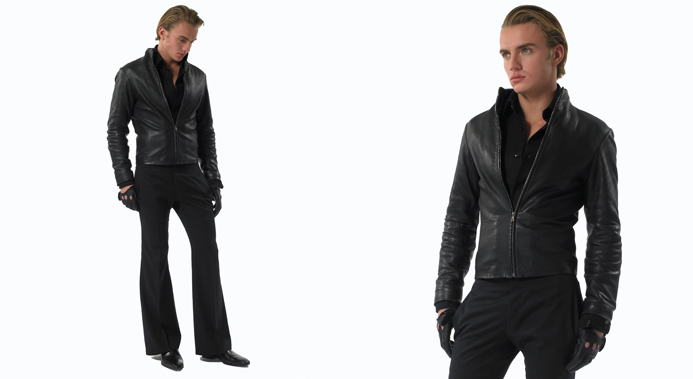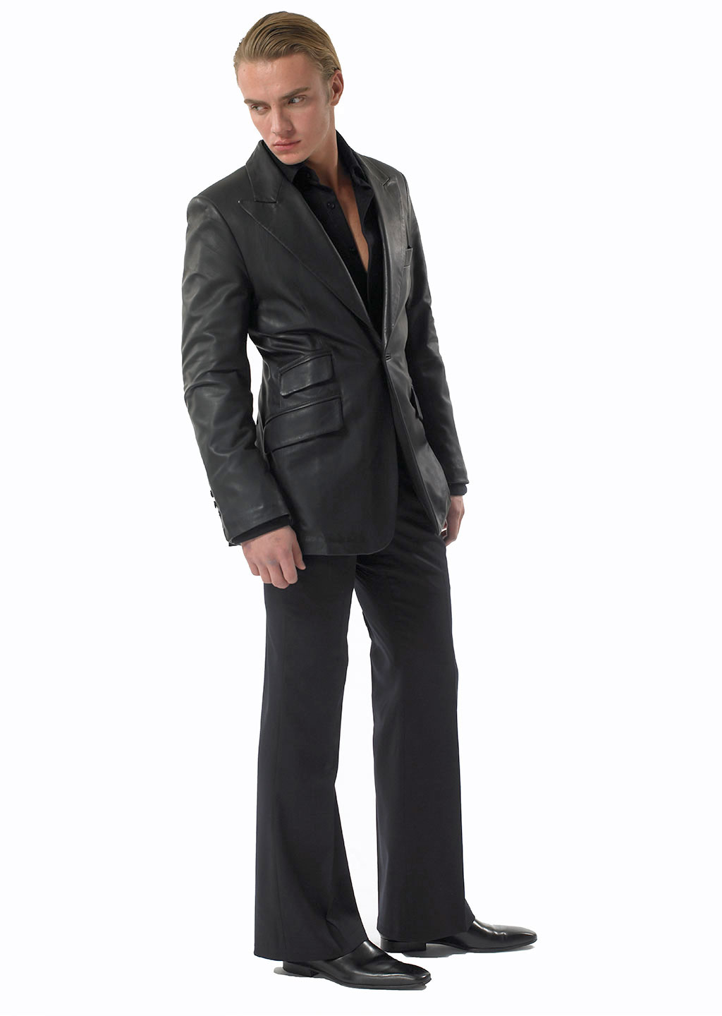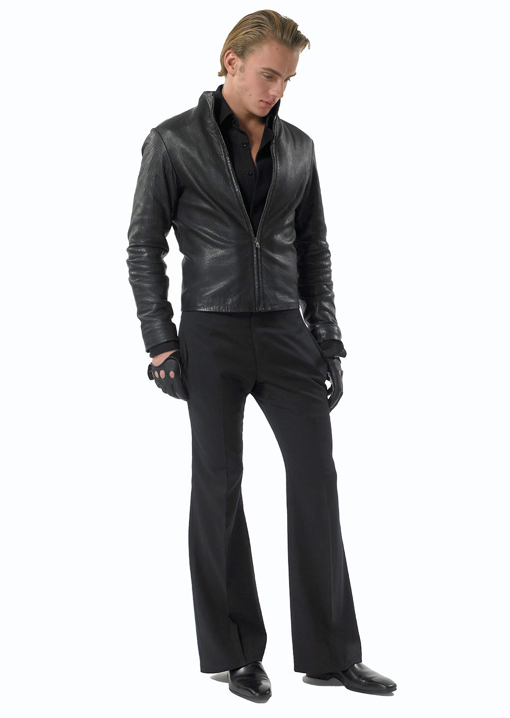 NAVY LAMB LEATHER JACKET, CASHMERE AND SILK SHIRT, WORSTED WOOL SLACKS. CUSTOM MADE SHOES.