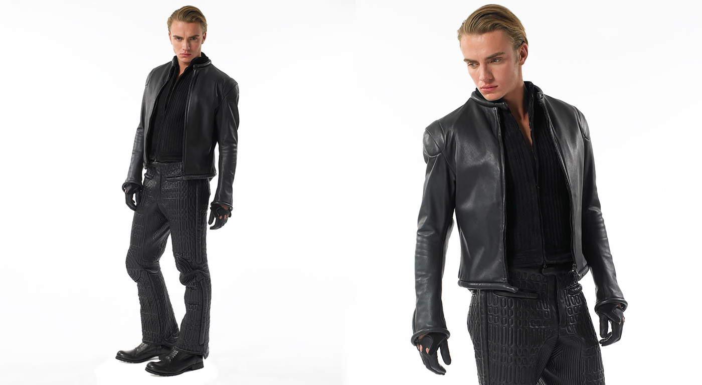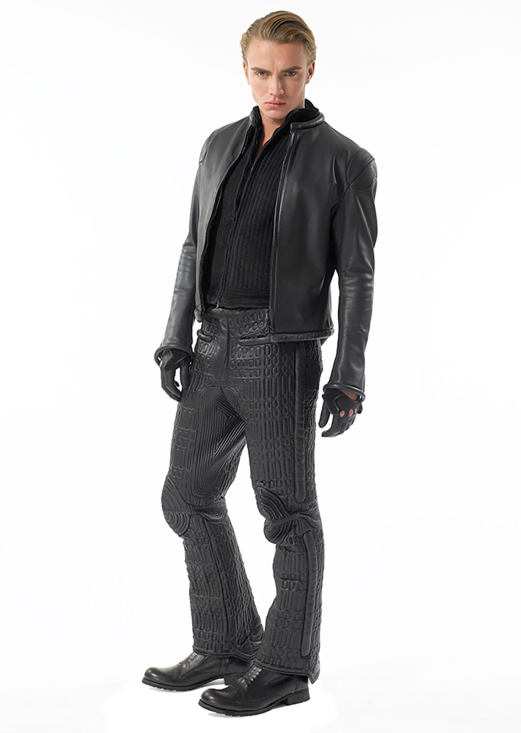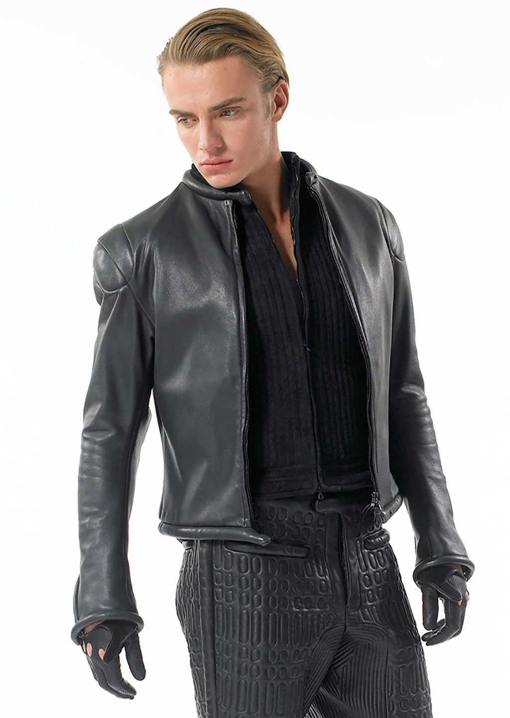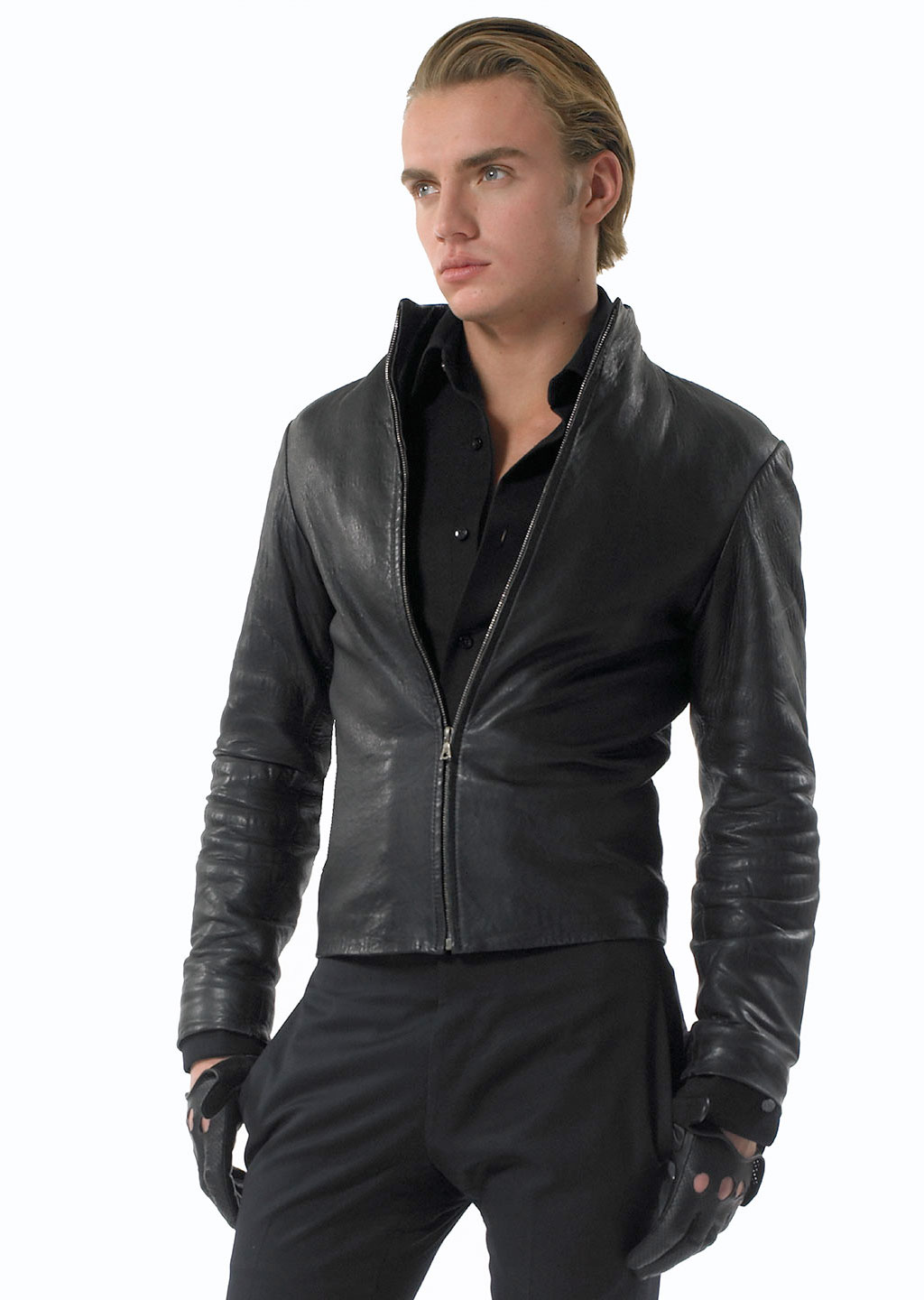 NAVY LAMB LEATHER JACKET, CASHMERE AND SILK SHIRT, WORSTED WOOL SLACKS. CUSTOM MADE SHOES.