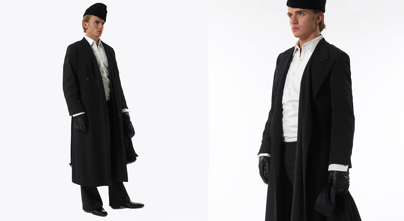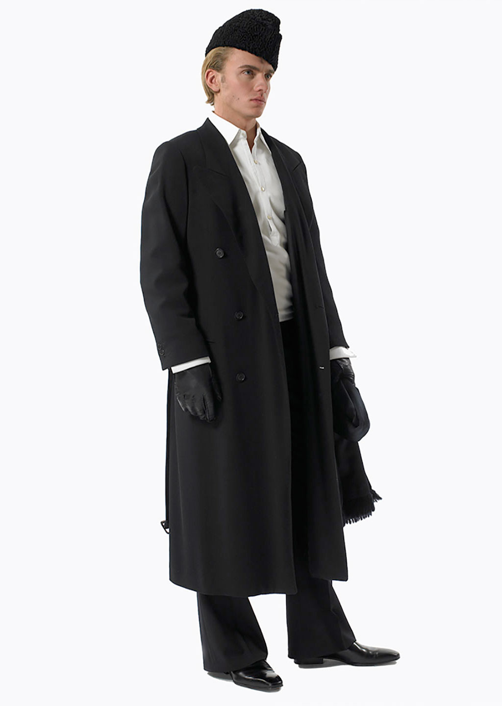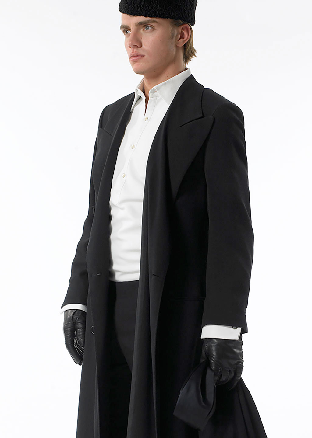 CASHMERE TOPCOAT, BIRDS EYE PIQUET COTTON SHIRT, CUSTOM MADE CHARMEUSE SILK SCARF.