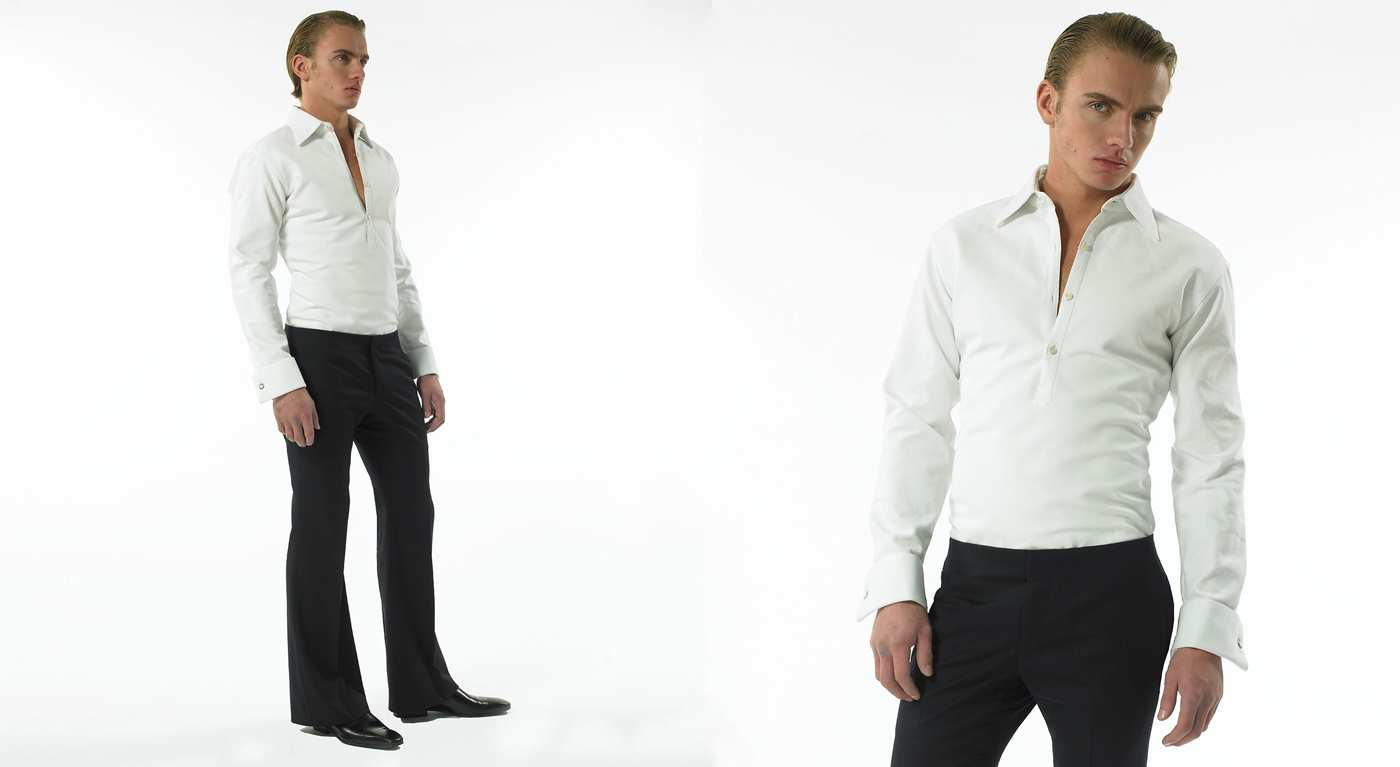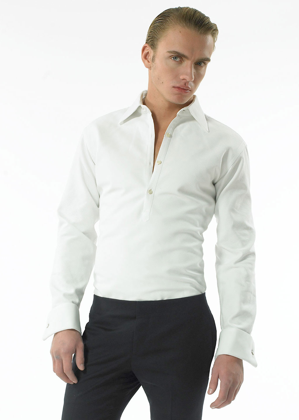 BIRDS EYE PIQUET COTTON SHIRT, DETACHABLE BUTTONS, WORSTED WOOL SLACKS, CUSTOM MADE SHOES.