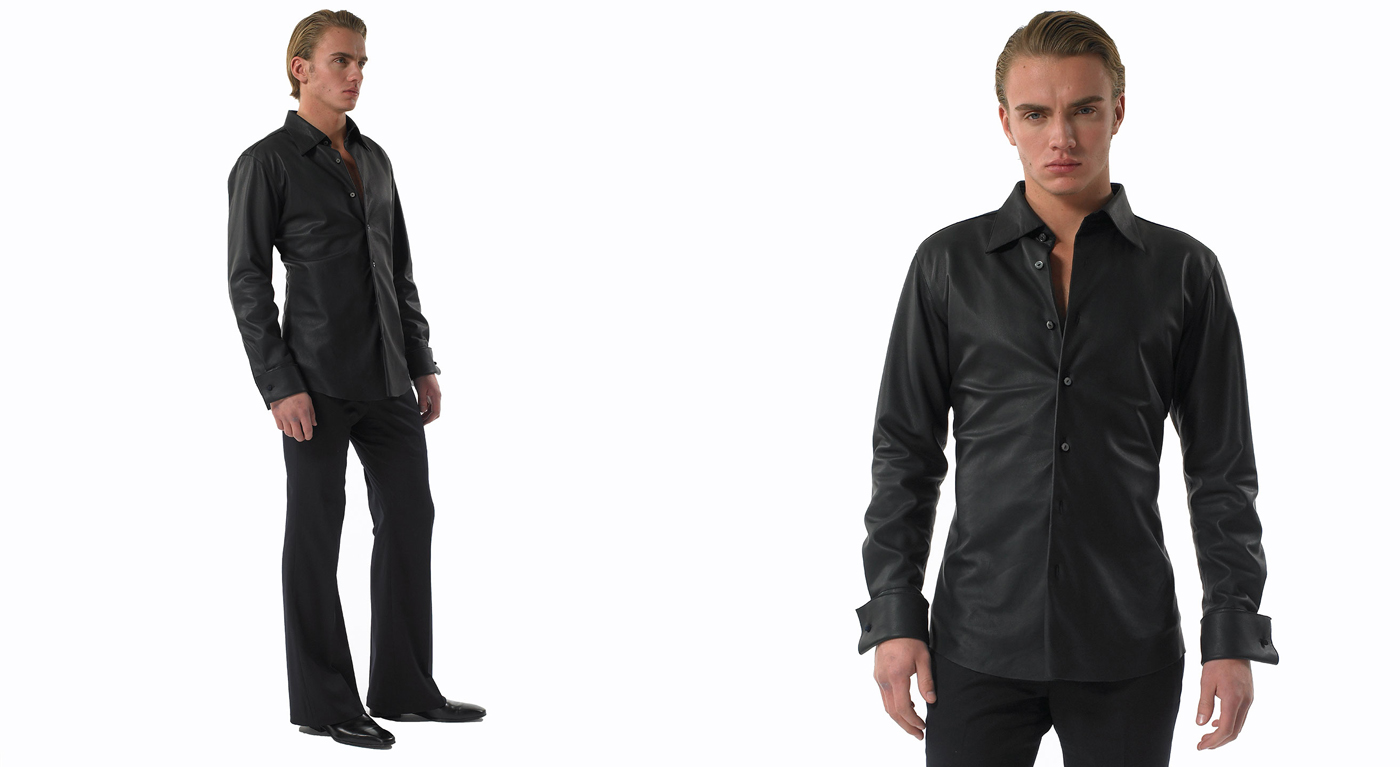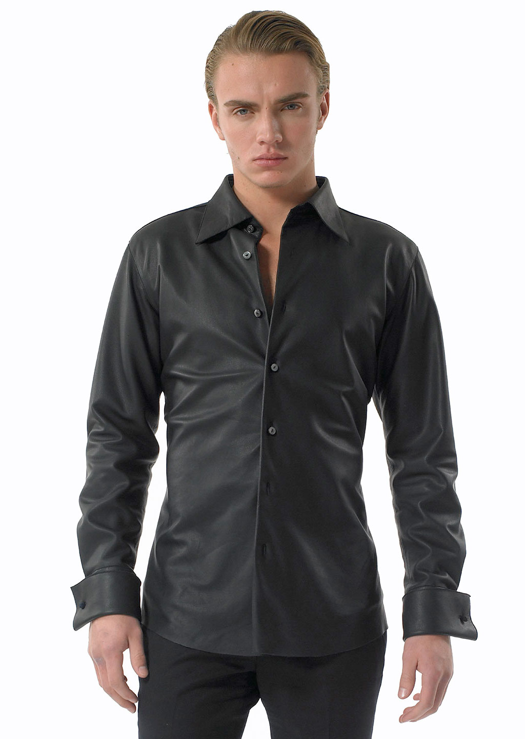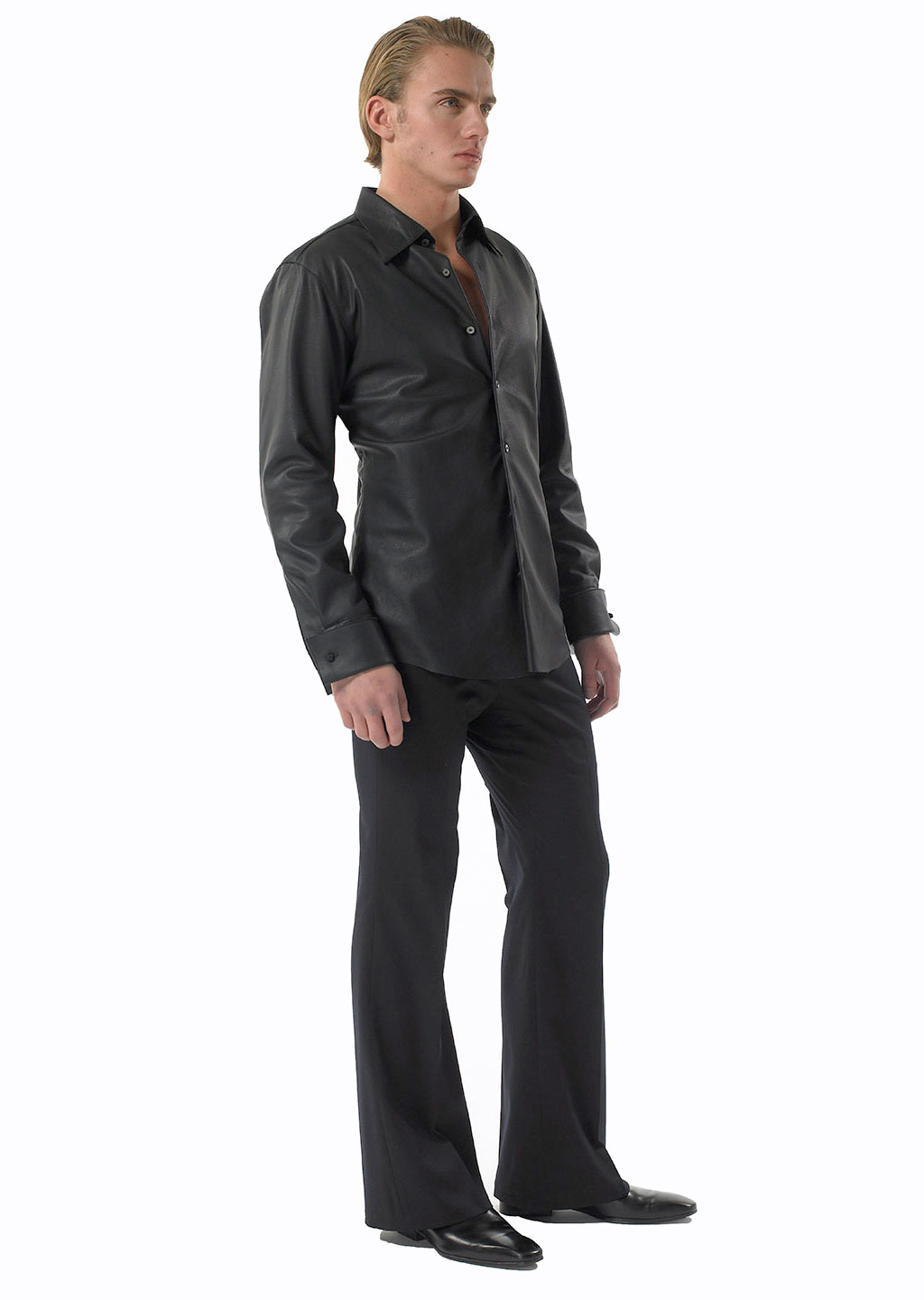 MIDNIGHT BLUE KIDD LEATHER FRENCH CUFF SHIRT LINED IN SILK, WORSTED WOOL SLACKS.