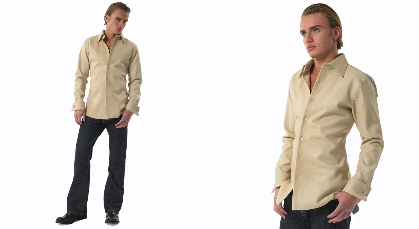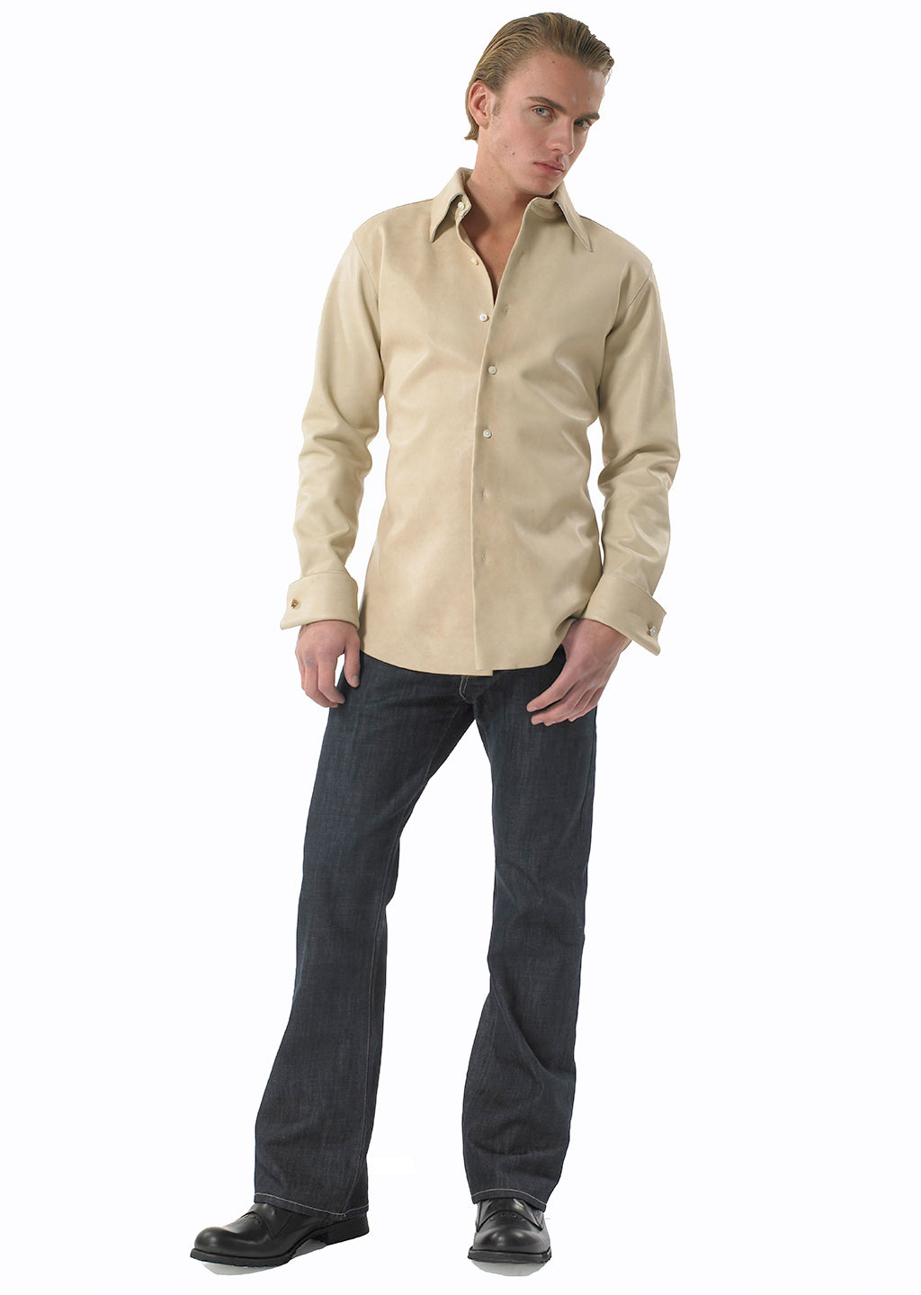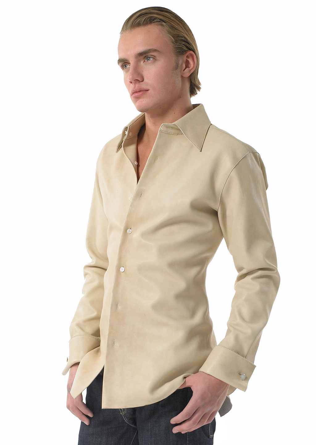 CREAM FRENCH CUFF LAMB LEATHER SHIRT LINED WITH SILK, CUSTOM MADE JEANS AND BOOTS.