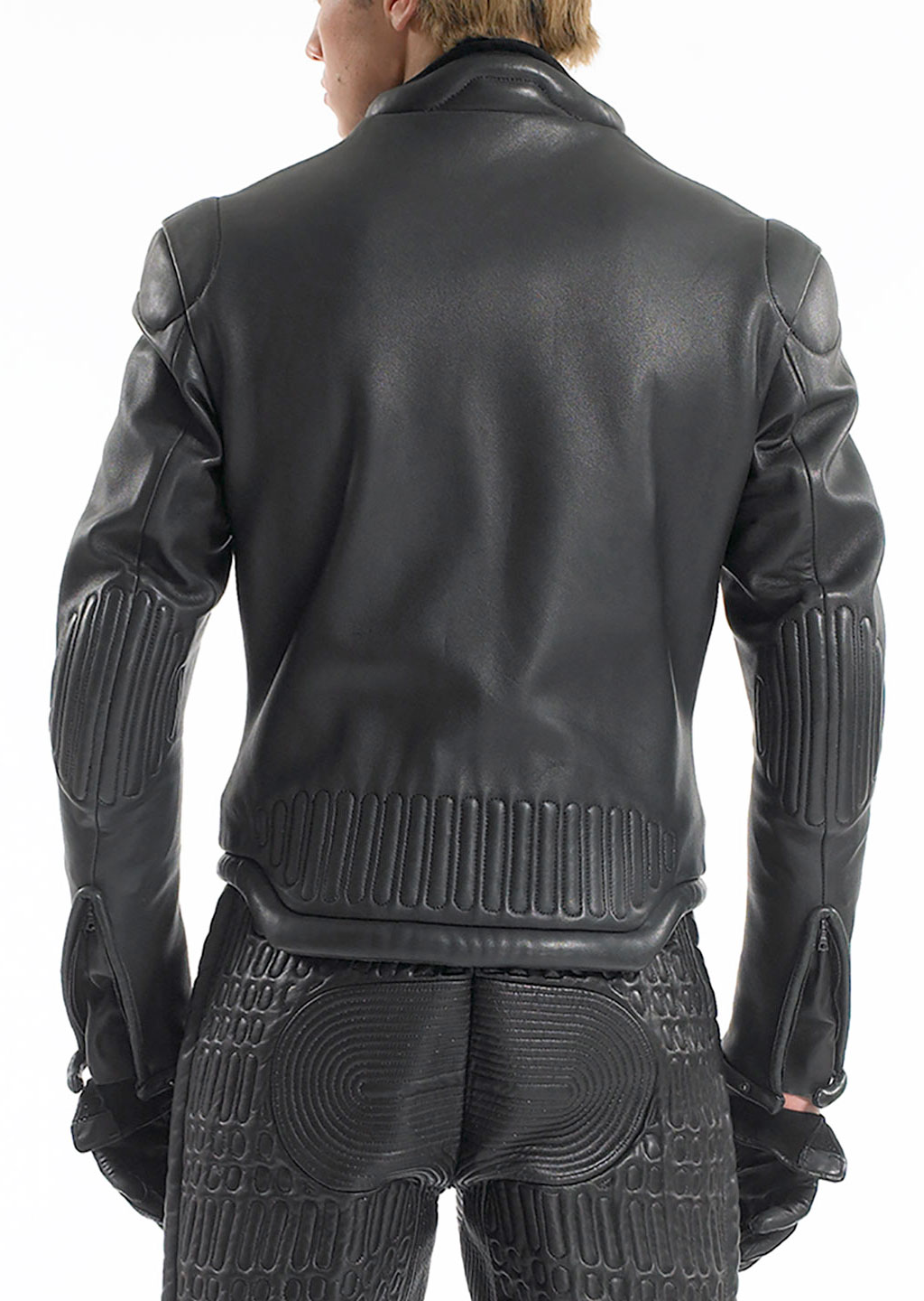 HAND QUILTED CUSTOM MADE NAVY KIDD LEATHER MOTORCYCLE JACKET AND PANTS, CUSTOM BOOTS.