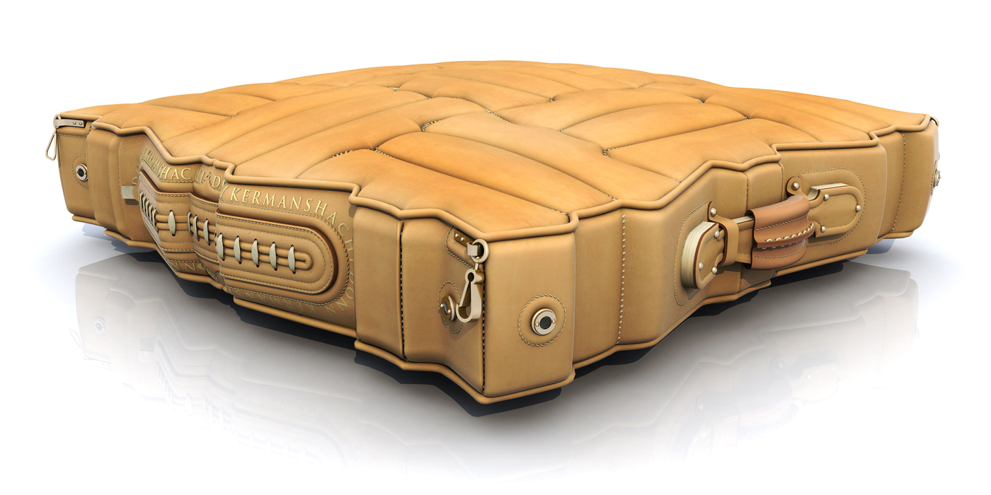 3 FOOT X 3 FOOT NATURAL BUFF LEATHER FLOOR CUSHION, BRONZE AIR INTAKE OPENINGS AND HARDWARE CONNECTORS.