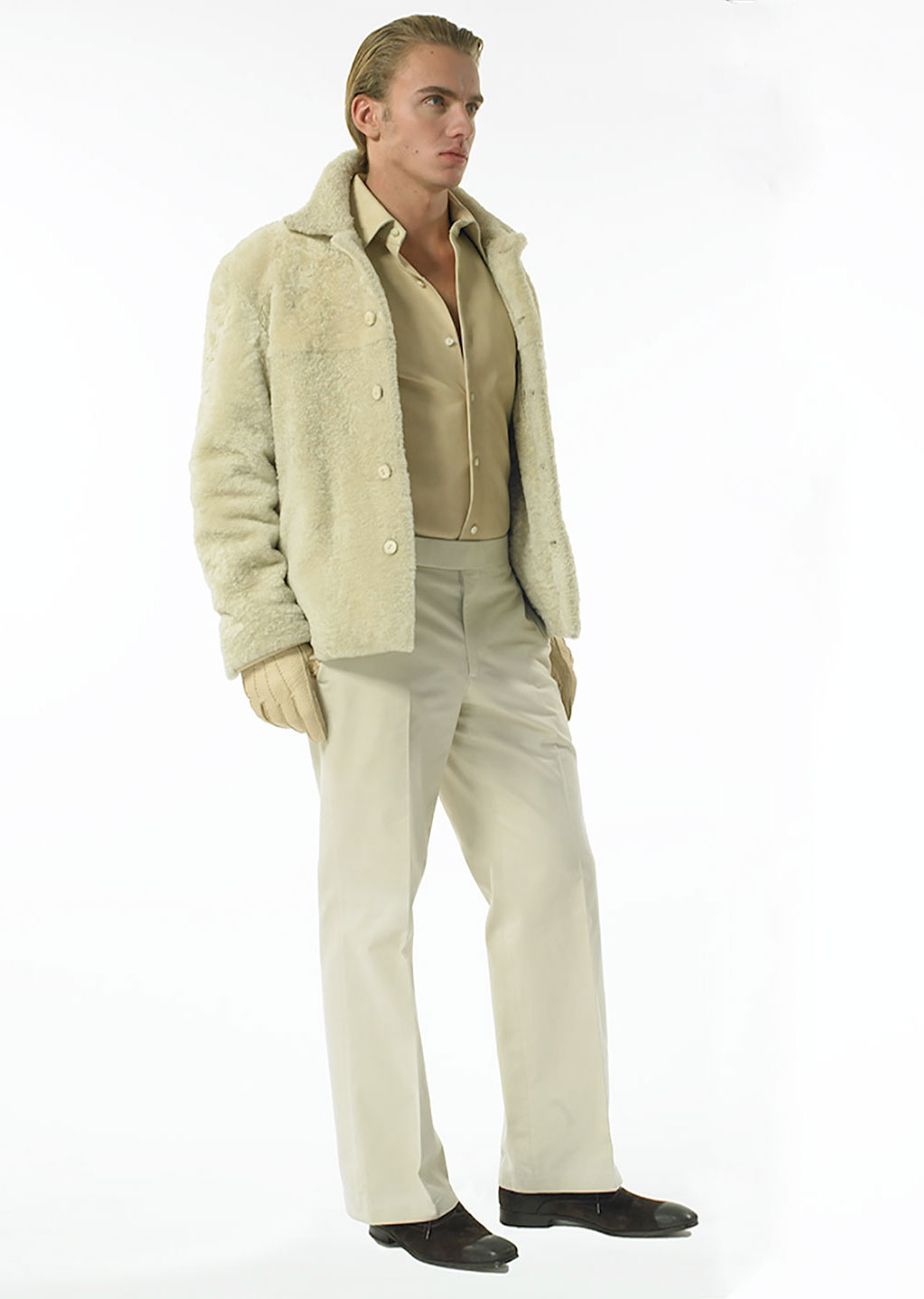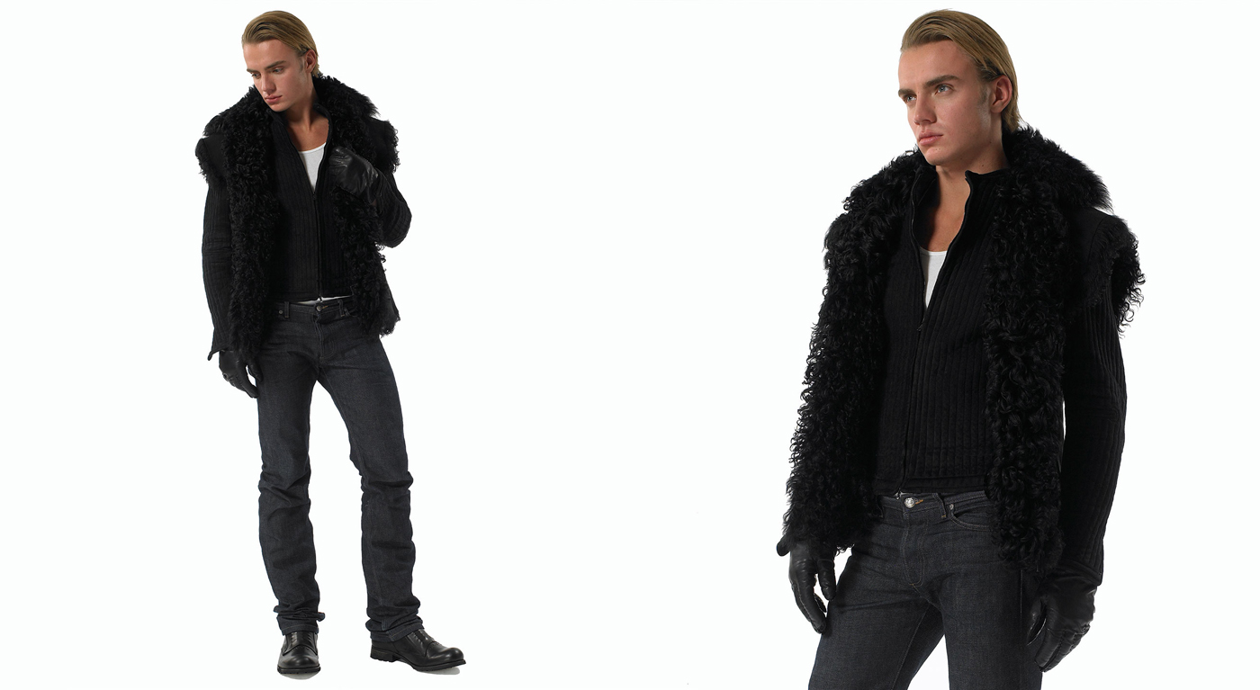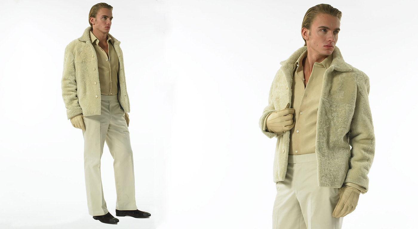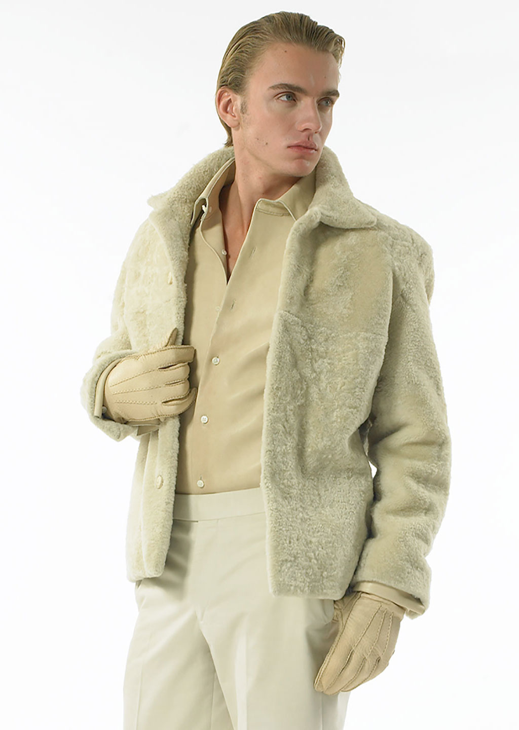 KARAKUL SHEARLING JACKET, LAMB LEATHER AND SILK LINED SHIRT, CUSTOM GLOVES.