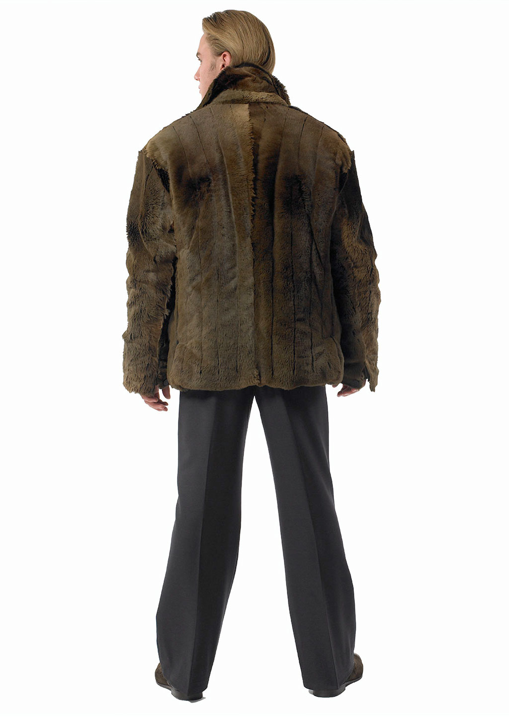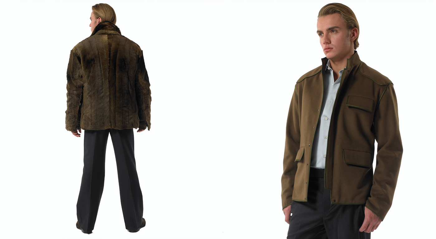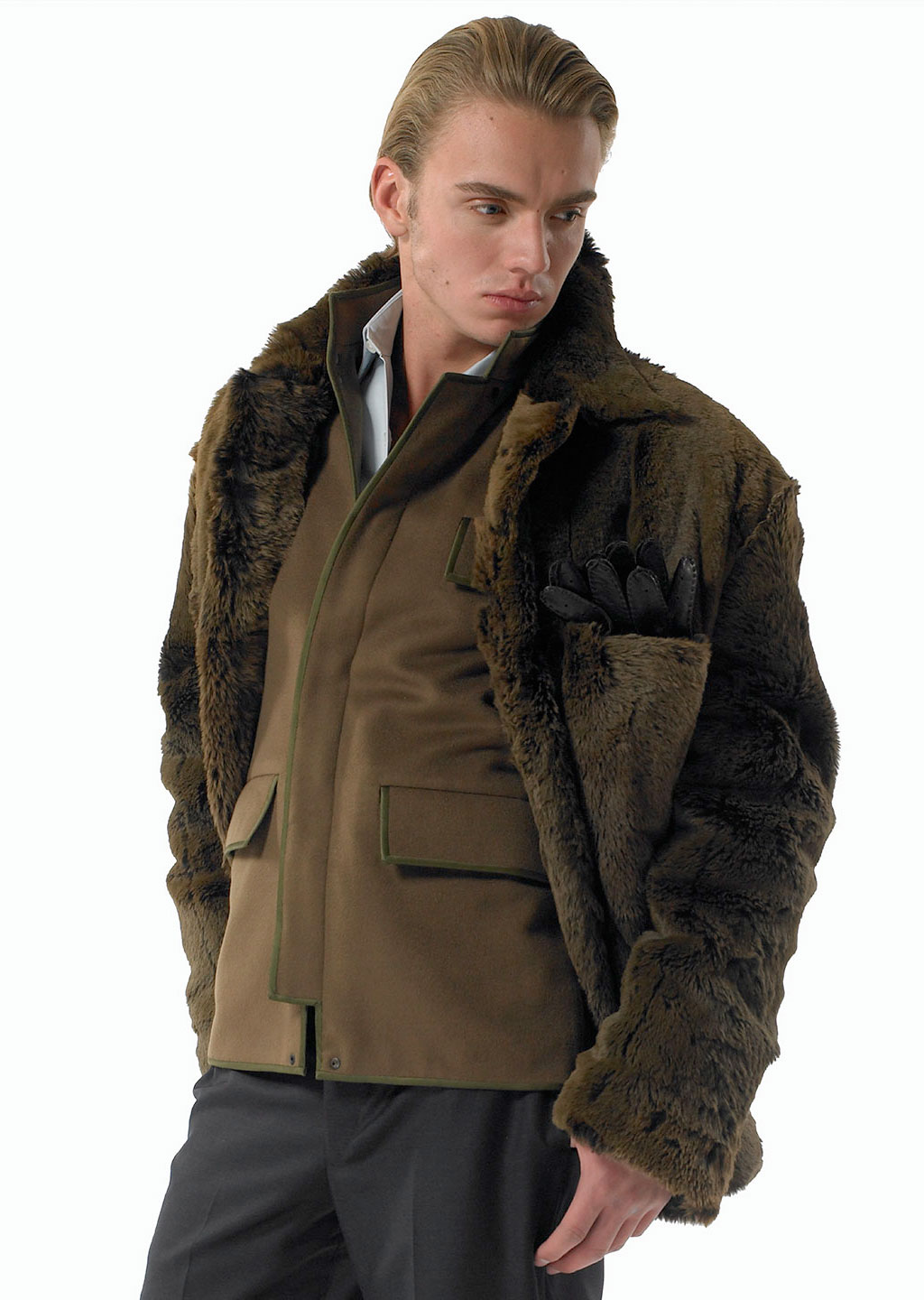 KANGAROO FUR OVERCOAT, CASHMERE AND SILK DETACHABLE LINING, CHARCOAL WOOL SLACKS.