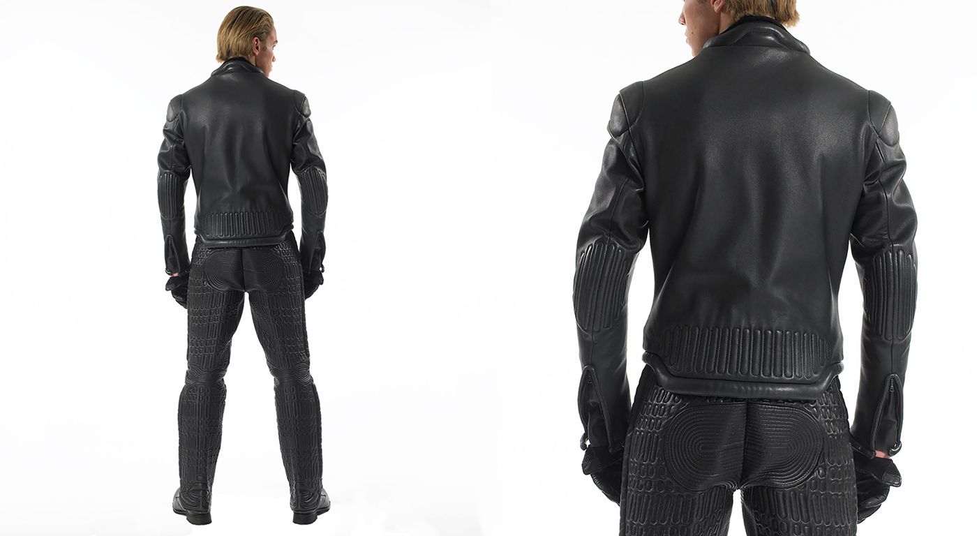 HAND QUILTED CUSTOM MADE NAVY KIDD LEATHER MOTORCYCLE JACKET AND PANTS, CUSTOM BOOTS.