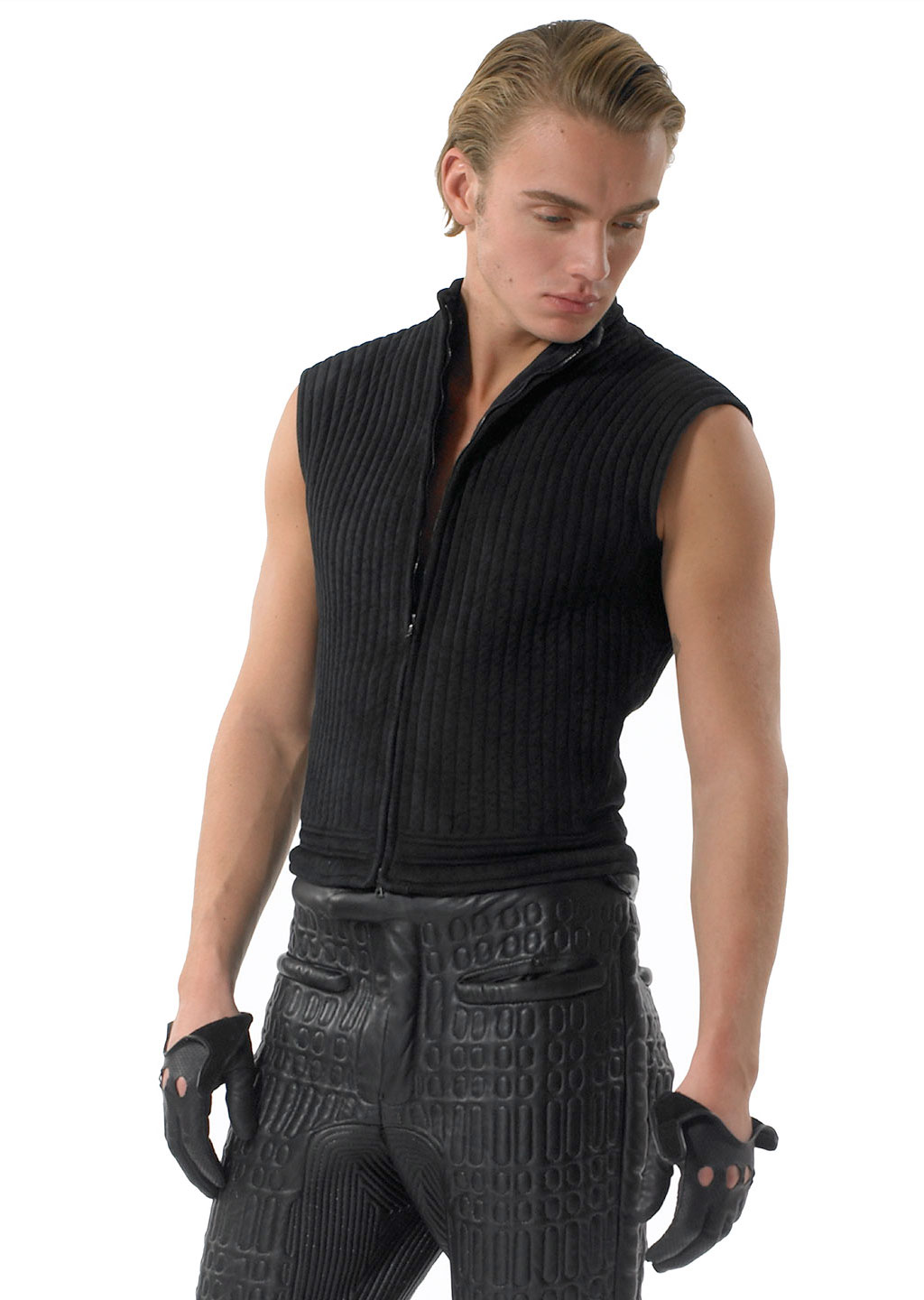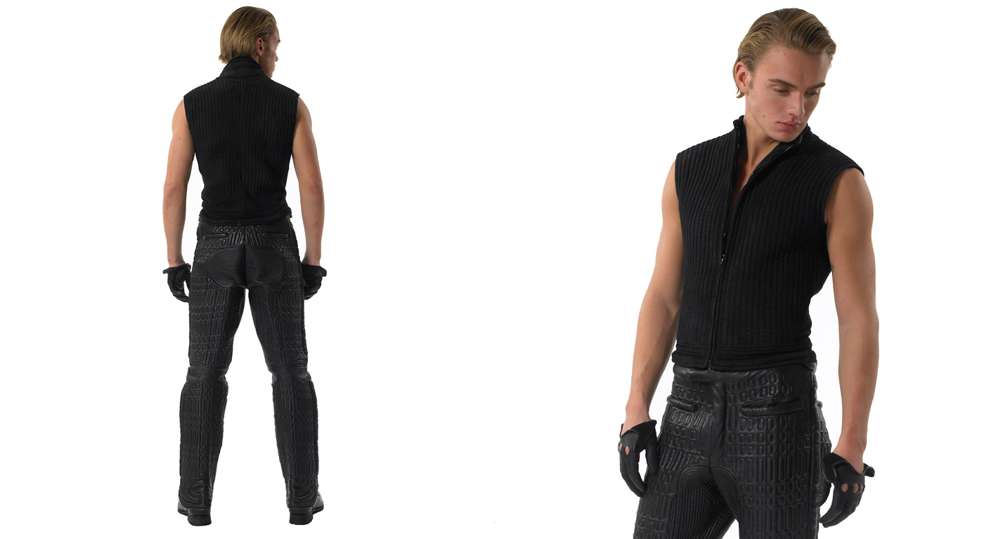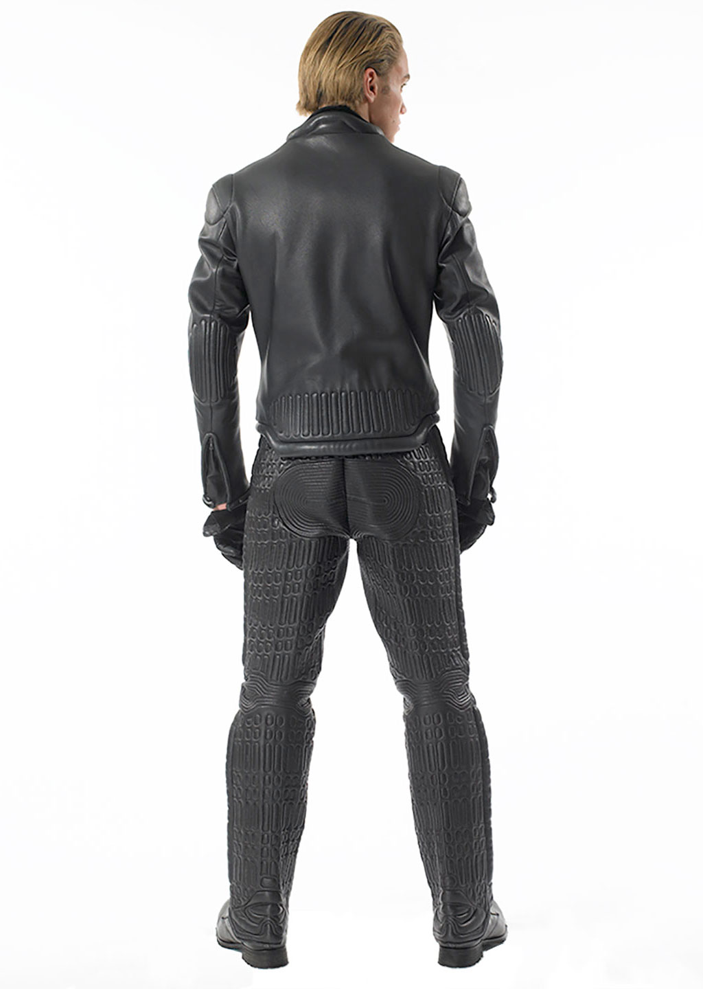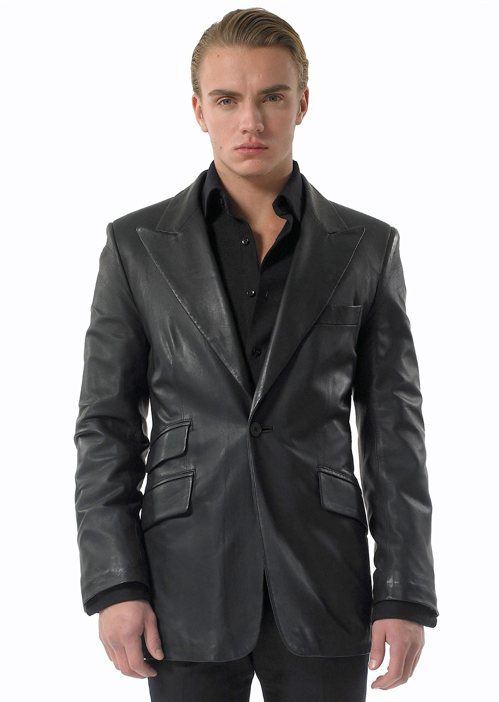 NAVY LAMB LEATHER JACKET, CASHMERE AND SILK SHIRT, WORSTED WOOL SLACKS. CUSTOM MADE SHOES.