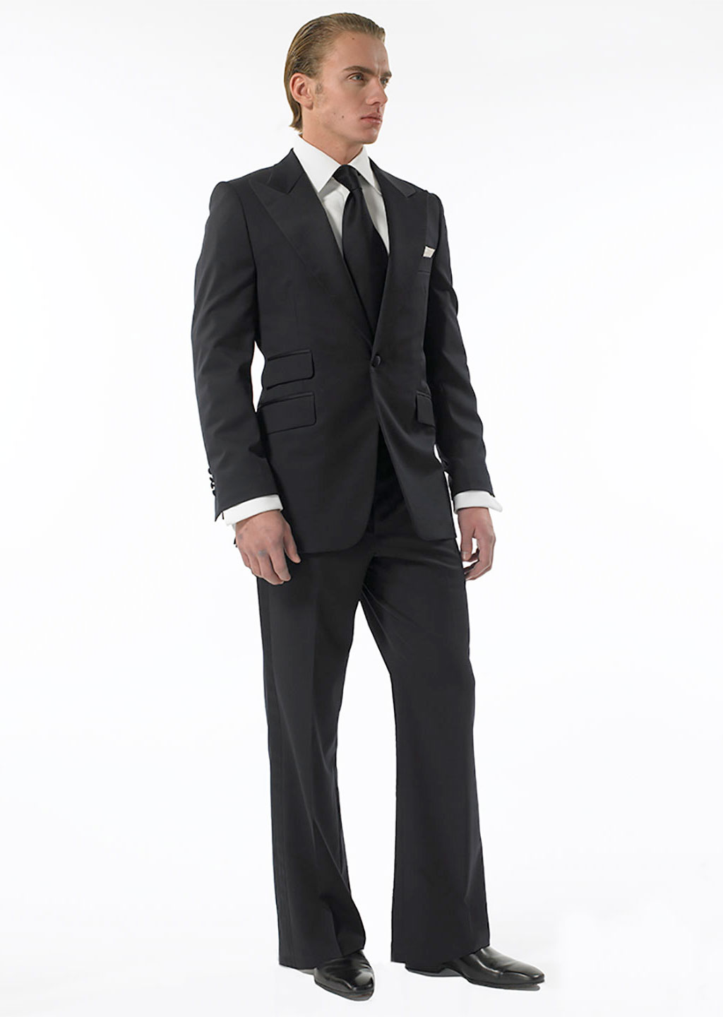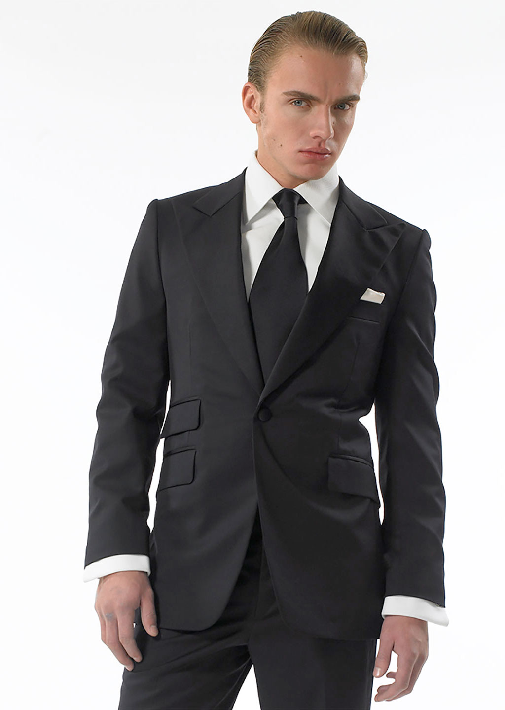 BESPOKE NAVY PEAK LAPEL SUIT, BIRDS EYE COTTON PIQUET SHIRT, CUSTOM MADE NAVY SILK TIE AND SHOES.