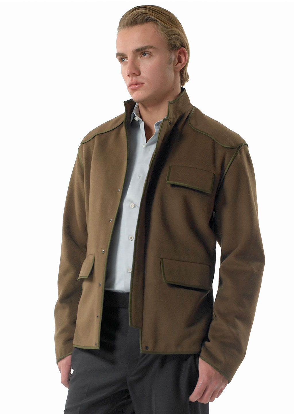 HAND QUILTED GAZELLE SUEDE AND CASHMERE JACKET, COTTON SLACKS AND SHIRT.